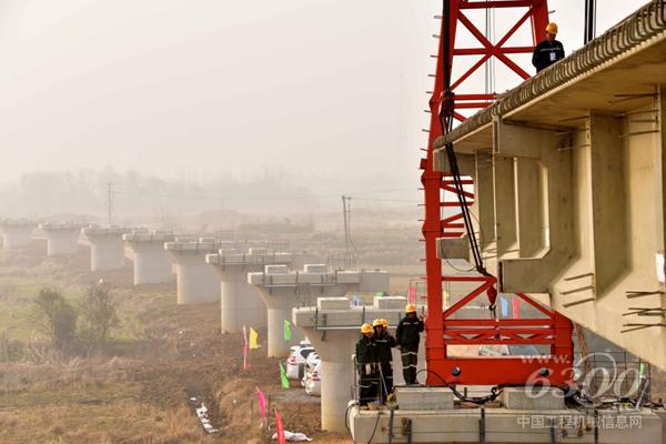 1月18日,中铁十一局职工在湖北省天门市境内安装江汉平原货运铁路一期工程姚家河大桥第一片桥梁。新华社记者 杜华举 摄