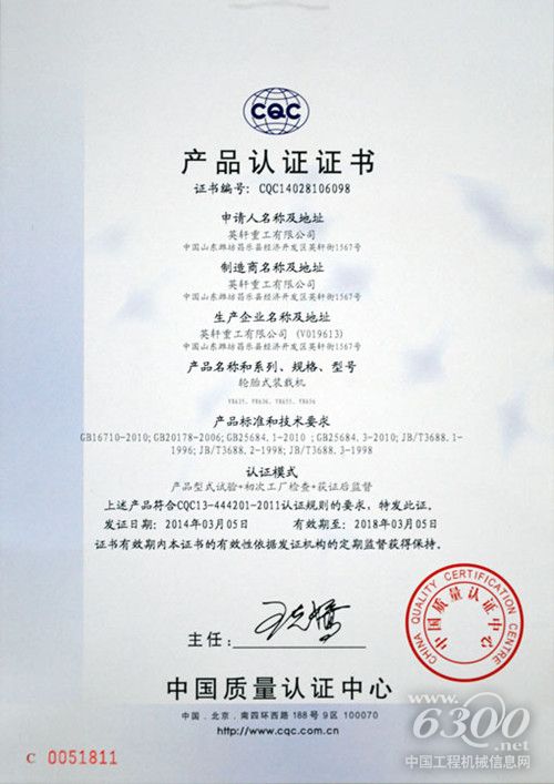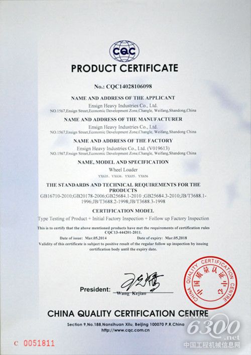近日,英轩重工YX635、YX636、YX655、YX656四款产品顺利通过中国质量认证中心产品标志认证(简称“CQC标志认证”)。
