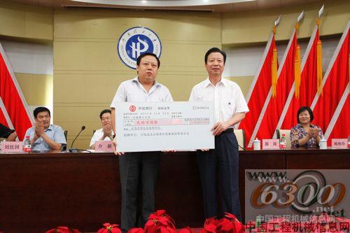 在全场掌声雷动的热烈而欢快的气氛中,高远圣工总经理陈琦代表公司向河南理工大学教育发展基金会捐赠“百万应急管理定向奖学金”的第一笔捐款20万元。王裕清副校长代表理工大学向陈琦总经理颁发了捐赠证书。