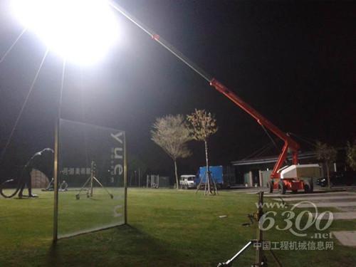 摄影组人员在高空作业平台上携带一超大灯光照亮了整个月湖公园美术馆,