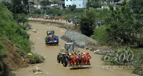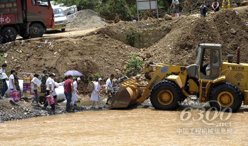8月5日,在震中鲁甸龙山镇,由于道路连续塌方,多处受阻,很多救援力量凭借坚强意志,与时间赛跑,徒步十几公里进入震中。厦工装载机临时搭起一座移动爱心桥梁,帮助救援力量运送救灾物资,转移受灾群众。