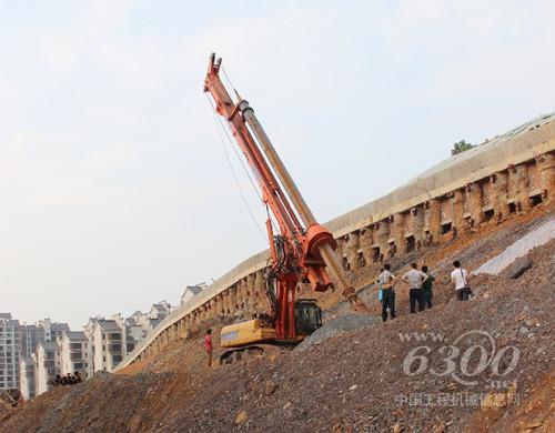 我们回访小组来到工地上,"JOVE“旋挖钻机就停在半山腰上,山下就是食品厂厂房。为了防止山体滑坡,必须要建设一百多根护坡桩来牢牢的护卫山体。从山下望去,280D显得特别高大,稳稳的屹立在山坡上。刚完成了两根桩的施工作业。我爬上山来,察看了两根桩孔,成桩漂亮,桩孔非常整齐,桩底捞渣干净。现场设备负责人向我们介绍,此台设备让他最省心,没出任何毛病,相比原来某厂家的旋挖,它更省油,施工效率更高,省时,在前一项目时赢得了工期。而且它进口的底盘,稳定性好。在这山坡上施工,放心。