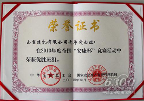 据悉,在山东重工集团,潍柴集团获得“2013年度全国‘安康杯’竞赛优胜单位”荣誉称号,而山重建机青年突击队荣获“2013年度全国‘安康杯’竞赛优胜班组”荣誉称号。