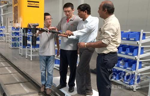 杜全文(左一)现场给印度员工翻译拧紧机使用规范