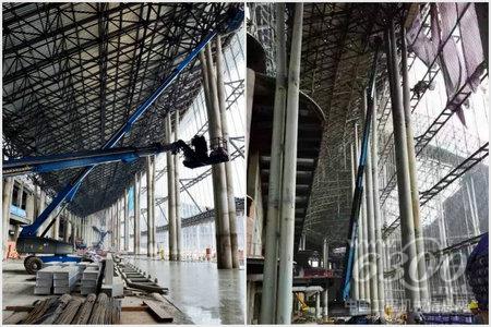 就在此时,吉尼高空作业平台给西博城的建设指了一条明路。场馆内的钢结构立柱高达35米左右,屋顶面积达30万平方米,工程量大,对施工的稳定性也有一定的要求。因此工作区间在27米至35米区间的Genie® S™-80和Genie® S™-105自行式直臂型高空作业平台能有效提升该工况的生产力,并且吉尼直臂型高空作业平台具有出色的水平伸展能力,可旋转的自调平台可以帮助操作工精确定位到工作点,因而尤其适合西博城涉及到的大量墙柱喷漆施工工作和屋顶排水系统、外墙保温层安装。“吉尼的爬坡能力也令人赞叹。根据货车行驶设计的陡坡度对于吉尼高空作业平台来说也不在话下,工人们可以直接驾驶着它到达楼上进行施工,这省下了安排其他设备吊运设备的麻烦也节省下了很多工时。”高空作业平台租赁公司项目负责人夸赞道。“使用了吉尼高空作业平台后,施工的效率明显提升,相较过去采用脚手架的施工方案效率提高了30%。”