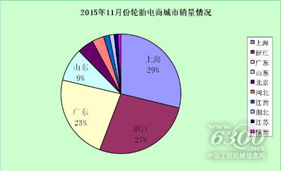 2015年11月份轮胎电商地域格局继续趋向多样化,曾经的电商地域“霸主”上海,本月份轮胎电商销量有所下降,仅占29%,浙江省本月销量攀至27%,屈居第二位。广东轮胎线上销量亦不甘示弱,奋力直追,占据23%。其他省市如山东等地电商也发展迅猛,试图在轮胎电商市场“分多一杯羹”,由此可见轮胎电商的的区域竞争更加激烈,冠军宝座随时可能易主。