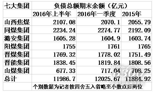 近日,山西省七大国有煤炭集团公司发布了2016年上半年财务等重大信息,21世纪经济报道统计发现,七大煤炭集团截至2016年上半年的负债总额达1.1986万亿,比截至2016年一季度时的1.2025万亿略有下降,但仍高于截至2015年末的1.1884万亿。