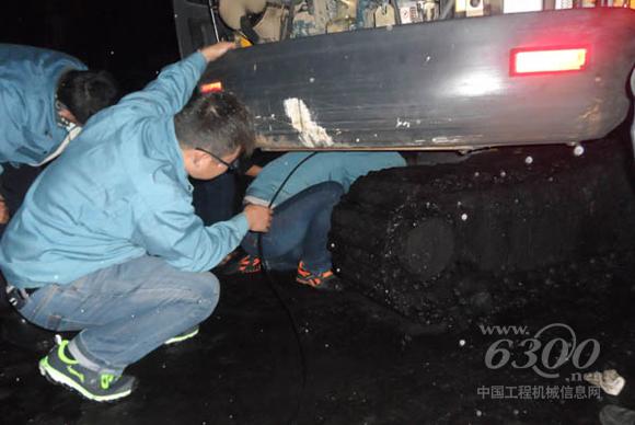 郑州到信阳全程约350公里,开车预计需要4个小时,为了赶时间并且保证安全,我们选择小组内驾龄最长的成员作为司机。争分夺秒,我们到达了邹老板的工地,此时天色越来越暗,远处的山开始变得若隐若现。寒暄之后,邹老板便急促的告知我们故障现象,并说明他明天施工的重要性。小组成员按照分工,进行全车检查、故障排除等。在确认油门拉杆没有问题后,下一步就是拆除挡泥板,检查油门拉线是否有问题,如果在平时这个过程很简单,但是在这个工地上却十分的困难,雨水和碳渣混合成的泥泞连走路都非常的艰难,但是,为了更快排除故障,小组成员王洪光不顾碳渣泥水立即俯身开始拆除挡泥板。挡泥板拆除后,队员们快速细致检查,很快发现问题点:油门拉线有折弯或已断裂,导致油门拉杆操作困难。此时,天色已晚,走访小组立即决定更换新的油门拉线,保证邹老板明天正常施工。
