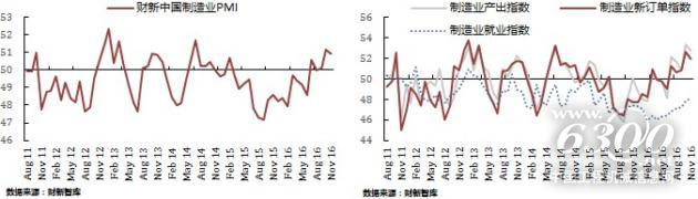 2016年11月统计局制造业PMI为51.7%,比上月上升0.5个百分点,延续上行走势,并创逾两年新高;非制造业商务活动指数为54.7%,比上月上升0.7个百分点,连续三个月上升,为2014年7月以来的高点,非制造业延续了平稳较快的增长势头,增速进一步加快。统计局PMI与财新PMI表现高度一致,11月经济继续回暖。