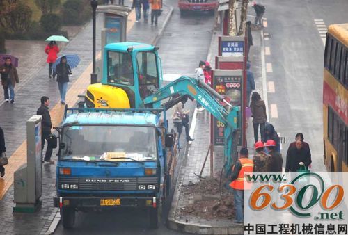 据现场的工作人员介绍,把挖掘机放在货车上作业,能够方便地移动作业;由于是履带式掘机机,放在货车上作业,也能减少对路面的损坏。