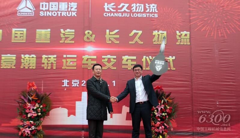 中国重汽销售部北京分公司总经理牟磊向长久物流合作发展部部长李涛交付车钥匙