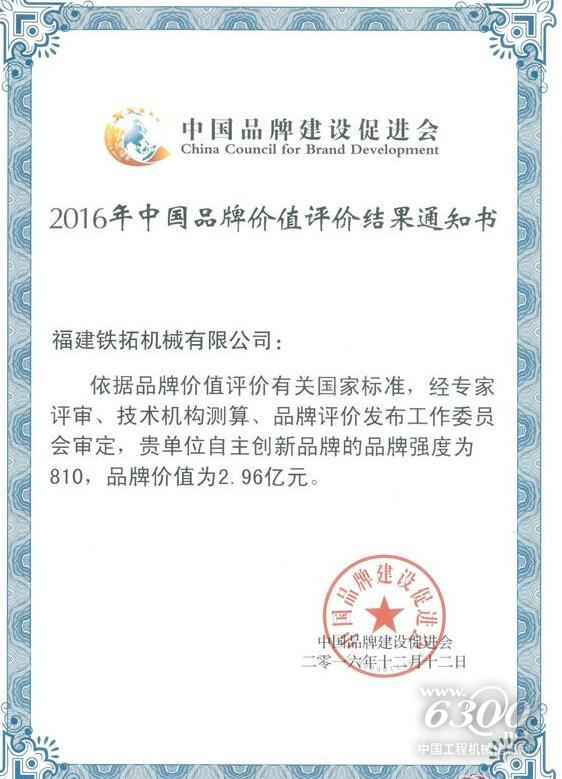 依据品牌价值评价有关国家标准,经专家评审、技术机构测算、品牌评价发布工作委员会审定,铁拓机械自主创新品牌的品牌强度为810,品牌价值为2.96亿,进入2016年中国品牌价值上亿榜单。