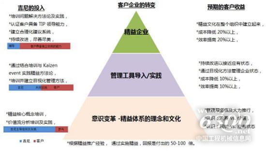 通过在客户端推广精益管理理念,吉尼协助客户进行精益改善,客户在操作流程、产品交付等多方面取得了巨大进步。其中有客户表示:“ 我们公司原来的管理流程太复杂造成浪费太多,效率低下。但在吉尼的帮助下进行流程改善活动,让我们看到了公司原部分流程分工的不清晰,也了解了更多其他人员部门的工作难度。吉尼带来的精益管理经验让我们打破了现有的经验和观念,为今后公司进一步的发展起到了关键性的作用。现在我们的人员、流程管理效率都得到了大幅提升;设备交付现场的时间更短、设备出租率也明显提高。”