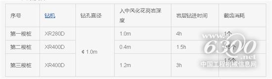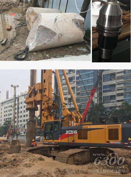 此工程为深圳市万豪大厦围护工程咬合桩施工,桩径¢1.0m,桩长22m左右,素桩不入岩,荤桩设计入中风化花岗岩1.5m,岩石饱和抗压强度80Mpa。现场有一台徐工XR400D、一台XR320D、一台XR280D施工,此工程之前使用的截齿70元一个,平均截齿消耗10个/米。