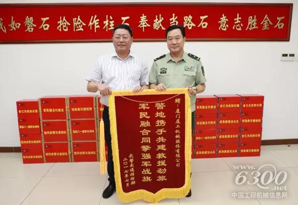 座谈会最后,白飞平总裁代表厦工全体员工向部队官兵送上了慰问物品,并表达了节日祝福;傅凌司令员代表武警交通部队将一面印有“警地携手共建救援劲旅、军民融合同擎强军战旗”字样的锦旗赠与厦工,对厦工多年来为军民融合做出的努力和贡献给予了高度的赞赏和肯定。