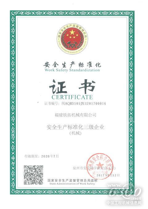 近日,铁拓机械正式获得“安全生产标准化三级企业(机械)”证书。