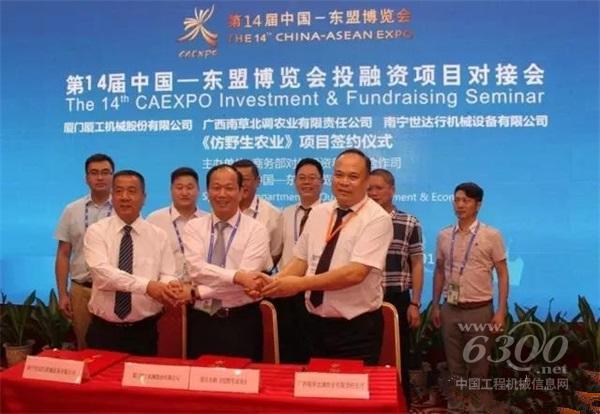 9月14日上午,作为第14届中国-东盟博览会的重要活动成果之一,厦门厦工机械股份有限公司(以下简称“厦工”)携手经销合作伙伴南宁世达行机械设备有限公司与广西南草北调农业有限责任公司隆重举行了“以草代粮“仿野生农业项目战略合作签约仪式。厦工董事长许振明、中国菌草产业联盟副主席罗运高、南宁世达行董事长陈荣共同出席签约仪式,并代表公司正式签约。