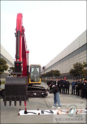 中国工程机械信息网(kfz9i.cn)记者现场获悉,中国挖掘机协会秘书长陈正利先生以及三一重工向文波等领导和嘉宾亲自为SY205C-8挖掘机揭幕。随后三一重机公司组织媒体参观生产线并到调试现场观摩,其中调试场观摩环节让许多媒体印象深刻,只见操作手上机鸣笛,向观众做致意动作,挖机作各种集体动作,灵活的机臂竟然能够用大号毛笔书写三一的英文“SANY”,更神奇的是,挖掘机的挖斗可以准确的铲起沙地里的一个生鸡蛋,操作手的技术令人叹服之余,也显示出了三一重机在控制技术上的一丝不苟,精益求精的态度。
