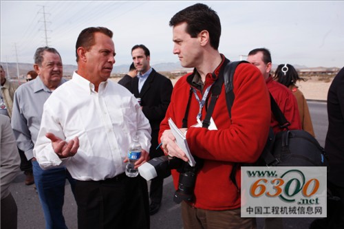 1月23日上午三一66米泵车新闻发布会结束后,与会的美国媒体、凤凰卫视记者、三一产品代理商、客户和观众近百人分乘4辆大巴前往离拉斯维加斯市中心15公里之远的西曼哈顿一商住群建筑工地,观摩三一66米泵车现场泵送工况。
