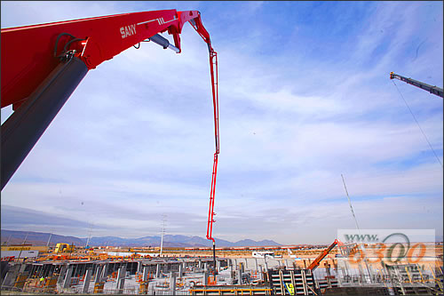 作为上海环球金融中心高层建筑施工的主打混凝土设备,三一超高压拖泵以40个小时不间断浇筑主楼底板30000余立方混凝土的泵送能力,保证了施工的高效率,在主楼封顶时,单泵将混凝土垂直泵送至492米的高度。