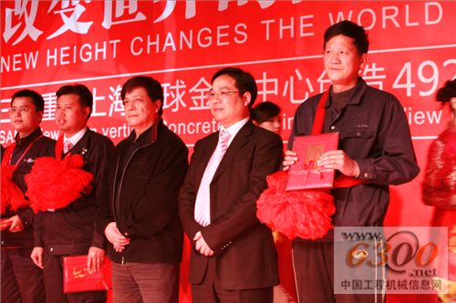 在主题会议现场,上海建工集团第一建筑有限公司副总经理许建强向三一重工副总经理周万春赠送一面锦旗,感谢三一重工在施工中做出的努力。随后,许建强和周万春又向一直战斗在上海环球金融中心施工一线的三一重工4位服务工程师、上海一建4位超高压拖泵操作手颁发了荣誉锦旗。