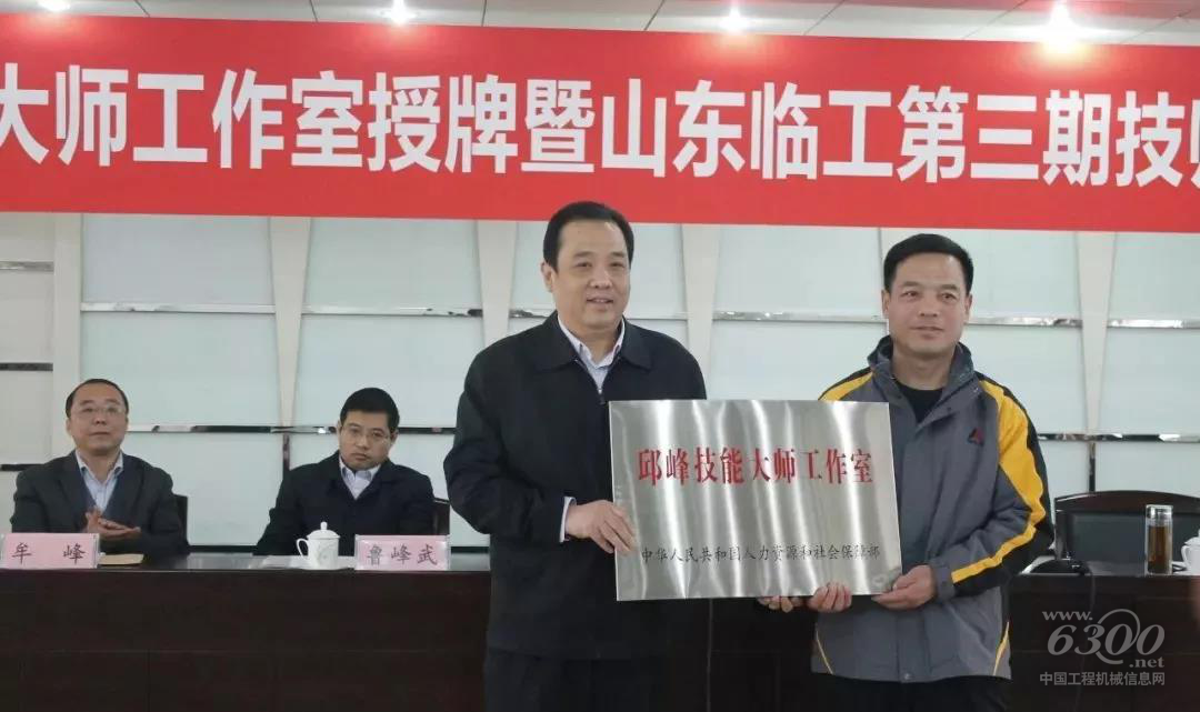 临沂市委组织部副部长、市人力资源和社会保障局党组书记、局长曹德玉向国家级技能大师工作室领办人邱峰授予“邱峰技能大师工作室”牌匾。曹局长在讲话中指出,临沂首家国家级技能大师工作室在山东临工授牌,是我市高技能人才队伍建设的一件盛事。我们将广泛宣传推广山东临工高技能人才培养的创新模式和成功经验,推动全市高素质技能人才队伍建设迈上新台阶。