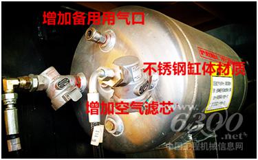 采用了不锈钢储气筒,储气筒进出气部位都加装了空气清洁过滤器和备用的快速接头方便客户打气使用。