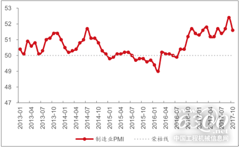 制造业PMI持续位于荣枯线以上景气区间。工程机械行业与制造业景气度、社会新增信贷活跃度等具有较为密切的相关性。本轮工程机械的复苏过程中,制造业的整体向好为行业反转持续性提供了有力的保障。根据最新数据,2017年10月,制造业PMI为51.6%,虽受长假影响环比小幅下降0.8个百分点,同比提升0.4个百分点,这是自 2016年8月以来连续第 15 个月站在荣枯线上方,制造业扩张发展态势已较为明确。
