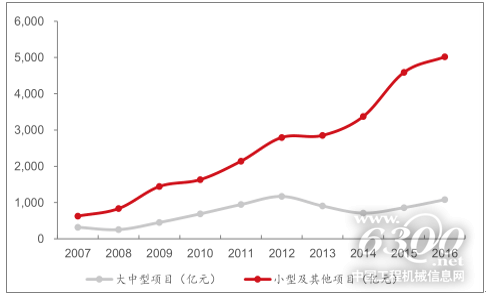 2017年将加快推进重大水利工程建设,计划新开工重大工程15项,在建投资规超模超 9,000亿元。2016年,我国水利建设完成投资额 6,099.6 亿元,同比增长 11.87%。其中,大中型项目 1,080亿元,同比增长 25.58%;小型及其他项目 5,019.6 亿元,同比增长 9.31%。同时,我国累计安排中央水利建设投资计划自 2013 年以来逐年稳步攀升,2016 年计划额大幅增长至 2,233亿元,同比增长 32.52%。截止至 2017年10月,我国累计安排中央水利建设投资计划已达到 2,545.8亿元,其中中央投资 1,558.6亿元,占比 61.22%。
