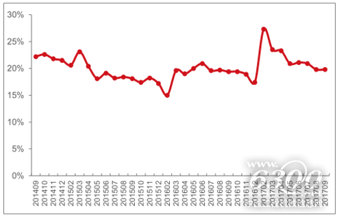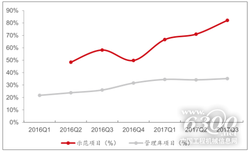 PPP模式助力基建项目,落地率平稳上升。截止至 2017年 9 月,全国 PPP 入库项目合计达14,220 个,累计投资金额约 17.8 万亿元。PPP 项目全生命周期包括识别、准备、采购、执行、移交共5个阶段,执行、移交项目之和与全生命周期项目数量的比值为落地率。将处于准备、采购、执行、移交阶段的项目纳入管理库,2017 年前三季度,国家示范项目落地数量572个,投资规模14,741亿元,落地率达到 82.1%;管理库项目落地数量2,388个,投资规模40,923亿元,落地率上升至35.2%,较上年同期增长3.6个百分点。