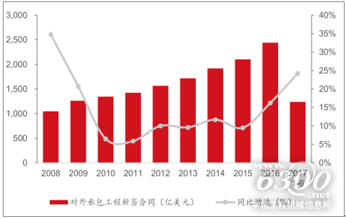 “十三五” 期间“一带一路” 沿线国家基础设施合在意投资需求预计在 10.6万亿美元以上,其中,中国以外沿线国家投资需求约 1.4 万亿美元。2016 年,我国对外承包工程新签合同金额 2,440亿美元,同比增长 16.2%。其中,“一带一路”沿线61个国家承包工程新签合同数量8,158份,合同金额达到 1,260亿美元,同比增长36.01%。最新数据方面,截止至 2017年上半年,“一带一路”沿线市场对外承包工程新签合同1,238亿美元,同比增速进一步上升至 24.2%。