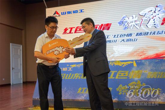 (山东临工工程机械有限公司总裁于孟生向凉山州扶贫移民局副局长彭兆武交付象征财富的金钥匙)