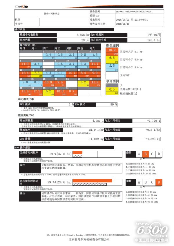 另一方面,ConSite还会为客户发送月度报告,让机主更好地掌控机器的运行情况。在ConSite为鲁忠孝提供的一份10页之多的月度机器操作信息报告中,详细地列出了机器状态、日常操作等信息,这其中包括但不限于:1、机器月度总油耗、每小时油耗等,及其与上月相比的差异;2、机器每天运转时间和油耗;机器每天的实际操作时间、无操作时间以及发动机关闭时间;3、机器的动力系统、液压系统各关键部件、关键指标的详细报告。与此同时,在报告中,ConSite还会为客户提出有针对性的改进建议。