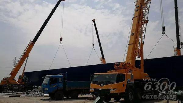 在七环建设线路中的一个出口建设工地上,4台徐工XCT90正在合力起吊一个重达116吨,跨度70米的钢箱梁。目前钢结构桥梁的广泛应用为城市交通的快速发展提供了有效的解决方案,钢箱梁的吊装都是采用单台或多台起重机抬吊进行作业的。徐工起重机作为业内首选品牌自然是当仁不让的工程主力,安全、高效、便捷、强劲让众多施工方的吊装方案变成了单项选择题。