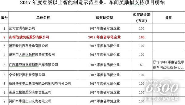 近日,2017年度湖南省智能制造示范企业名单出炉,山河智能装备股份有限公司成功入选,获百万资金奖励,该项奖励全省仅18家企业获得。