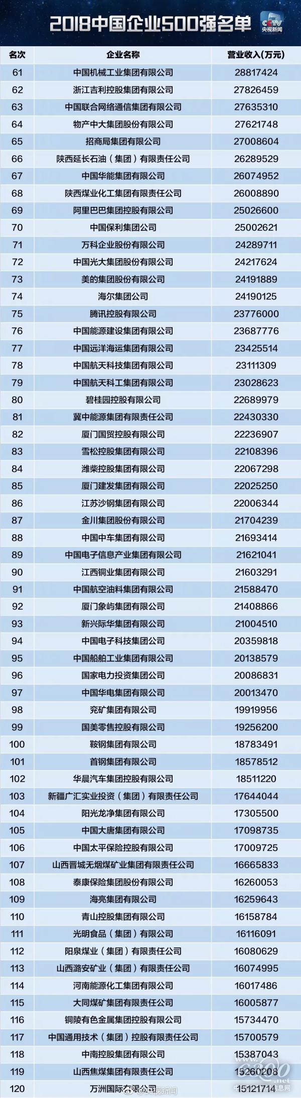 国机集团位列2018中国企业500强第61位