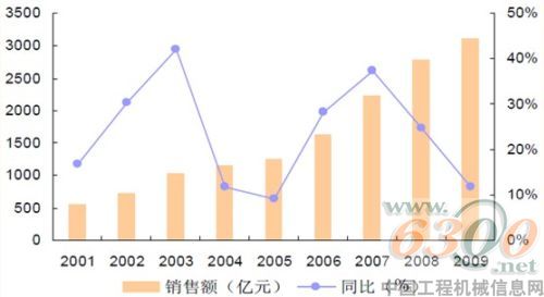 工程机械行业的发展与固定资产投资密切相关。自1999 年起工程机械行业进入一个全新发展阶段,国内工程机械行业发展步入快车道,2003、2007 年全行业销售额增幅都在40%左右。2009 年,工程机械行业实现销售收入3100 亿,同比增长12%,成为机械工业的第四大产业,销售收入位居全球第二位,产销量第一位。