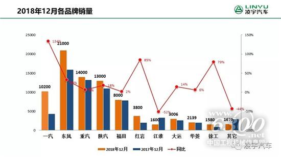 第八名大运,12月份销售3006辆,同比增长14%;2018年累计销售32281辆,同比增长9%,市场占有率2.8%。华菱重卡12月份销售2139辆,同比增长6%,全年累计21733辆,同比增长16%,市场份额为1.9%。徐工重卡12月份销售1580辆,同比增长79%;全年累计销售17304辆,同比增长34%,份额为1.5%,排名行业第十。