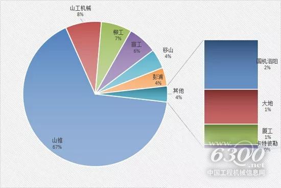 品牌分析:2018年全年,山推累计销售推土机5059台,占总销量高达66.6%,即市场上每售出三台推土机就有两台是山推品牌。山工机械累计销售推土机611台,占总销量8.0%;柳工与宣工分别销售521台和494台,分别占6.9%和6.5%;移山、彭浦各销售300多台。
