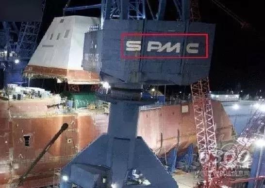 值得注意的是,美国公开新一代朱姆沃尔特级驱逐舰的建造情况时,吊装战舰上层建筑的吊机上也有SPMC的字样。SPMC是原上海港机股份有限公司的英文名称,目前已被振华港机收购。