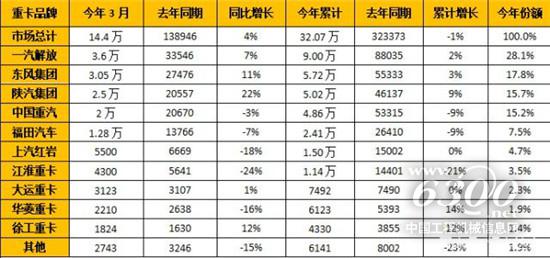 3月份,重卡市场同比增长4%,一季度累计来看,市场共计销售32.07万辆,与上年同期的32.34万辆基本持平。