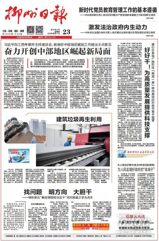 5月23日,《柳州日报》头版和《柳州晚报》三版分别以“建筑垃圾再生利用”“建筑垃圾变废为宝”为题,对柳工开展的柳州市移动式建筑垃圾资源化项目进行了重点宣传报道。