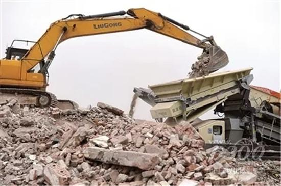■在市移动式建筑垃圾资源化项目基地,柳工设备对建筑垃圾进行第一道工序重型筛。