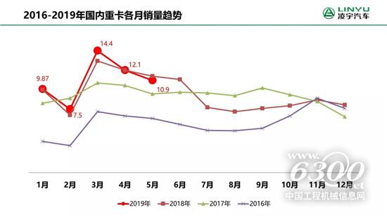 今年的重卡市场开局不错,一季度与去年同期持平,3月份传统旺季以14.4万辆的成绩打破纪录。而4月份市场由正转负,出现了3%的下降。5月份,我国重卡市场约销售各类车型10.9万辆,环比今年4月下降8%,比上年同期的11.4万辆下滑4%。那么6月份开始,进入传统淡季,市场将如何发展呢?