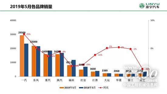 东风进一步稳固了亚军的行业地位。5月份,东风重卡销售2.2万辆,同比增长2%;今年1-5月,东风重卡累计销售10.49万辆,同比增长5%,市场占有率提高到19%,稳居行业第二。