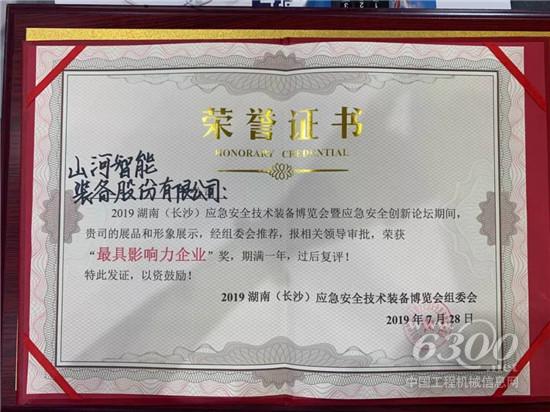 在本次展会期间,因展品和形象展示,山河智能被组委会评为“最具影响力企业”,并荣获组委会颁发的“最具影响力企业奖”。