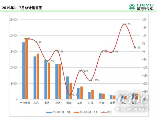 今年1—7月,我国重卡市场累计销量73.23万辆,同比去年的 74.64万辆下降2%,小幅下滑。