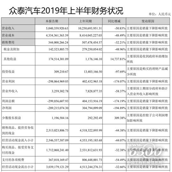 步入2019年,众泰汽车业绩持续恶化。根据众泰汽车发布2019年半年度报告显示,其上半年完成销售收入50.4亿元,同比下降50.83%,归母净利润亏损2.9亿元,同比大降195.37%。新车销量方面,2019年上半年众泰汽车累计销售新车仅6.38万辆,同比下滑44.52%,仅完成年销量目标的21.27%。