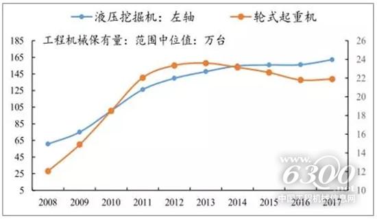 根据工程机械协会公布的工程机械保有量,截至2017年底,挖机和轮式起重机的保有量分别为155.7~168.6万台和21~22.8台,根据历年保有量范围的中位数,近年来挖机保有量保持缓慢增长,而起重机保有量甚至在2013年高点之后出现下滑。