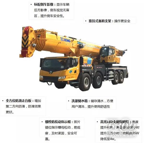 标配倒车影像、洗漱储水箱、轮胎螺栓防松动指示帽;高光LED支腿照明灯,亮度提升40%,寿命提升五倍;副臂双尖销轴设计,穿轴更方便;铝型材走台板全方位防滑设计;一体式铸造配重标识,吊装作业更安全;全新设计上车攀爬扶梯配置,整机更加统一协调,使用更加便捷,推拉式备胎支架,操作更安全、轻便。